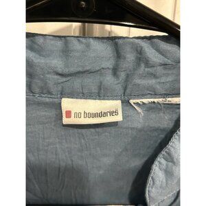 chambray, ruffle, beaded, Button-down blouse, ruffle detail, No Boundaries, blue shirt, women's fashion, casual wear, formal blouse, versatile top, lightweight cotton, long sleeves, elegant design, office wear, breathable fabric