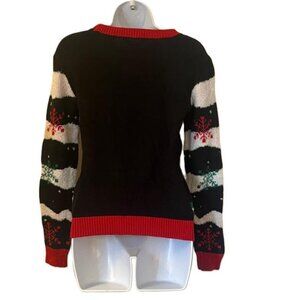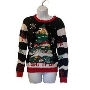 The No Boundaries Christmas Tree Light it Up Holiday Ugly Sweater in size small is a festive and whimsical addition to your holiday wardrobe. This cable-knit sweater features a solid pattern with a crew neck and long sleeves, perfect for a casual occasion like Christmas Eve. Made from a comfortable cotton blend and acrylic material, this sweater showcases a multicolor design with Santa Claus character details. The pullover style sweater is designed for a regular fit, making it a cozy and fun choice for the winter season.