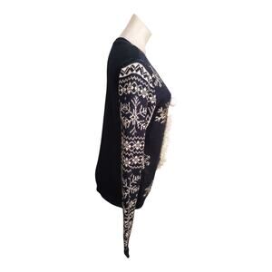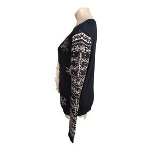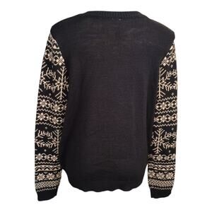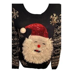 In very good condition please review the photos measurements are in them. The No Boundaries Christmas Ugly Sweater in Navy features a crew neck and a pullover style, perfect for the winter season. This knit sweater with fair Isle sleeves and Santa Claus character accents is great for travel, parties, or casual wear. The multicolor design with sequins and snowflake details adds a festive touch to your holiday wardrobe. Made from acrylic material, this lightweight and stretchy sweater is easy to care for with a hand wash only requirement. Perfect for juniors in size XL looking for a fun and comfortable Christmas sweater. Juniors size XL (15-17).