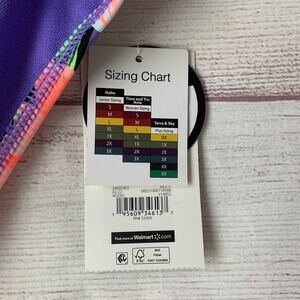 Multi-color neon tropical floral swimsuit bikini bottom by No Boundaries. This bikini bottom has a black background with neon green, orange, yellow, purple, and pink in the all-over tropical floral pattern. The lining is purple. It has a ruched vertical seam on the back. It is NEW, with tags.