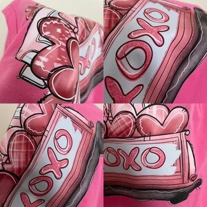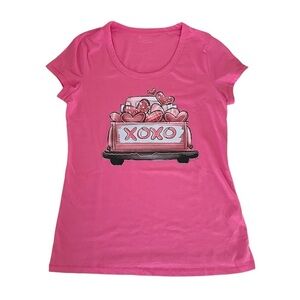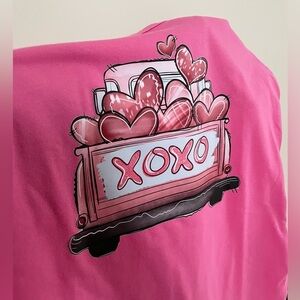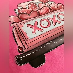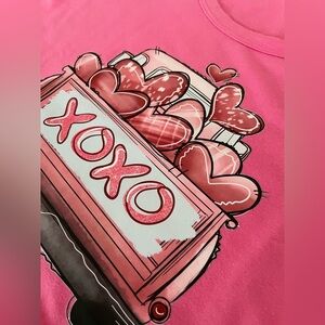 No Boundaries Pink Valentine’s Day XOXO Scoop Tee Short Sleeve T-Shirt. Juniors size medium (7-9). *May fit smaller than regular medium, see measurements below. 60% cotton, 40% polyester. New with tag attached, custom heat press flat graphic on front. Bright pink color. Designed with a truck filled with hearts. Thin, lightweight, with some stretch. See all photos.