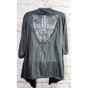 dark gray, open pointed front, 3/4 sleeves, crochet back panel insert, lightweight, soft, flowy, stretchy, Juniors