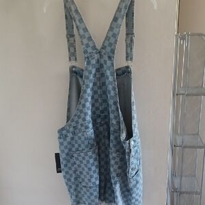 Stylish checkered denim jumpsuit. Features adjustable straps and front pocket. Perfect for casual outings.