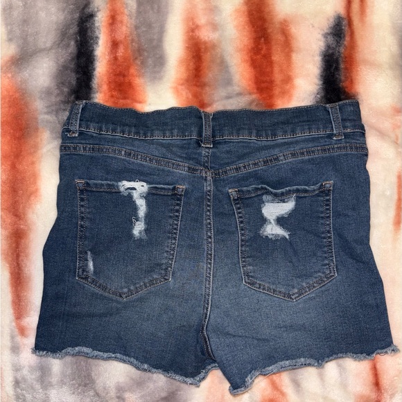 Trendy distressed jean shorts. Features frayed hem and back pockets. Ideal for casual wear.