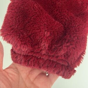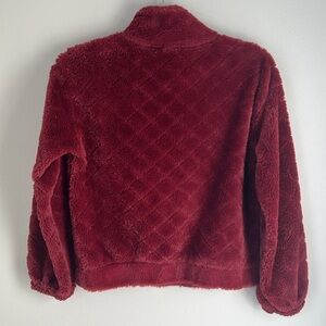No Boundaries Furry Jacket Half Zip Kangaroo Pocket Fleece Coat Women’s Small. The jacket is maroon and has a furry texture. Gold zipper, half zip. Size women’s small 3-5. Good condition.