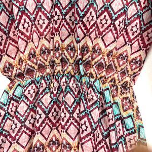 No Boundaries Diamond Geometric print in shades of Pink, Turquoise and Orange peasant Blouse Womens SZ L Flared Sleeves Cinched Waist Casual boho chic