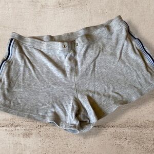 Short shorts with blue stripes down the sides. Comfortable and stretch cotton, polyester, spandex blend.