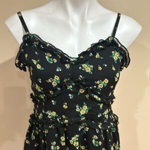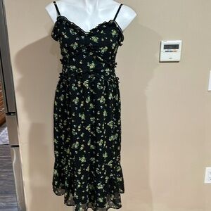 This sleeveless sundress by No Boundaries features a vibrant green hue with a ruffled, tiered design. The spaghetti straps and V-neckline add a touch of elegance, making it perfect for casual outings or a night out. Its midi length and flowy silhouette offer a comfortable yet stylish look.