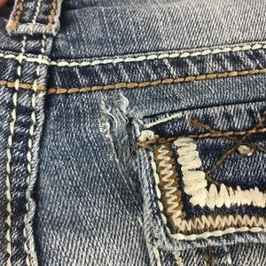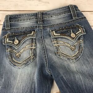 These jean capris have a four button front with 5 embellished pockets. See last pic for slight damage near rear pocket. In great condition. #0253