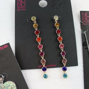 Brand new in packaging No Boundaries jewelry lot - 2 pairs earrings, 2 necklaces Plastic and silver tone heart earrings, rainbow and gold tone dangle earrings, 2 seashell necklaces silvertone - 13" with extender and 16' with extender Hypoallergenic