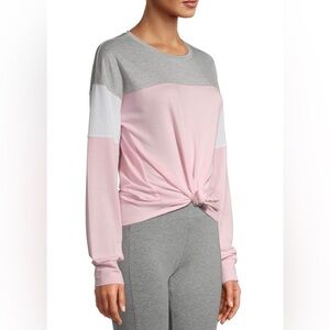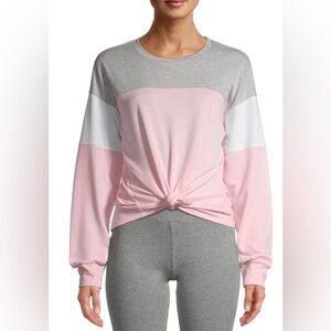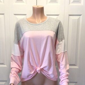 Introducing a stylish and comfortable top from No Boundaries, perfect for any casual or travel occasion. This twist tie front top features long sleeves, a round neckline, and a pullover closure. The top comes in a beautiful colorblock pattern with shades of pink, gray, and white, and comes with a matching hair scrunchy as a bonus accent.