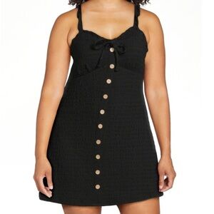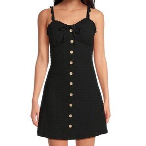 NWT, This Textured Faux Button-Front Mini Dress from No Boundaries is crafted in a soft pucker knit with a hint of stretch. This flirty dress is designed to flatter with a sweetheart neckline, shirred bust, ruffle straps, and a faux button front. FITS more like a smaller XL.