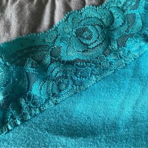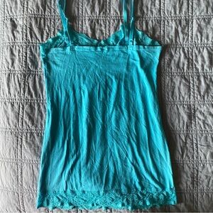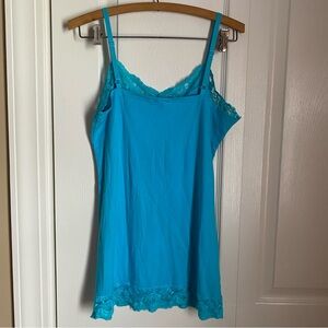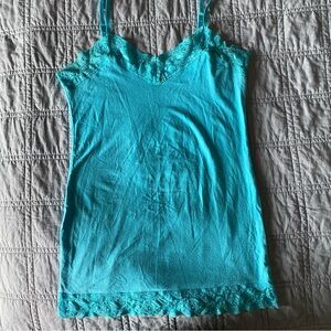 Chic turquoise aquamarine camisole with lace chest and bottom hem accents. Ideal for casual wear. Great for Y2K Style layering or by itself. Adjustable straps Juniors XL (15-17). Soft and stretchy. Fairycore. Twilight fashion. Grunge. Preppy. Back to school. Festivals. Coquette.