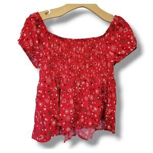 No Boundaries Juniors red bandanna print front twist Smocked short sleeves top