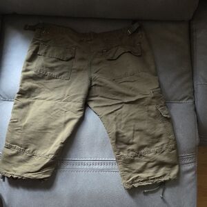 These capris are the perfect blend of style and practicality! With a relaxed fit and plenty of pockets, these are ready for any adventure. They feature a unique, distressed hemline that adds a touch of edgy style. They are in great pre-owned condition with no stains or tears.