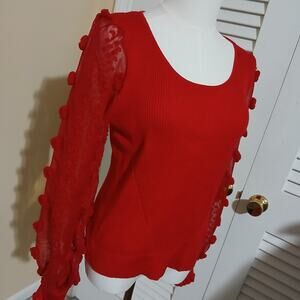 This red, long-sleeved sweater features a unique 3D-sheer design and ribbed texture, adding a touch of elegance to any outfit. Perfect for holiday parties, special events, or simply adding some festive flair to your everyday style.