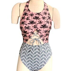 No Boundaries M Barbiecore Pink Palms & Chevrons Halter Lace-up Swimsuit 19417