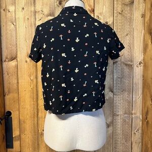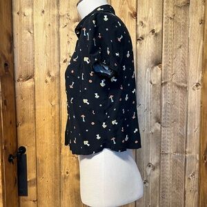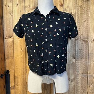 whimsy, whimsical, mushroom print, woodland, fairycore, goth, dark academia, cropped, cropped shirt, button front, Y2K, Y2K fashion, 90s style, 90s clothing, vintage clothing, vintage top, soft grunge, cottagecore, coquette, boho