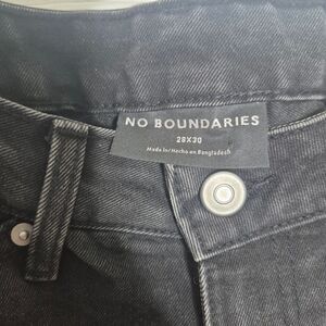 These relaxed black jeans from No Boundaries showcase distinctive artistic embellishments on the front, offering a creative twist to a classic style. The relaxed fit ensures comfort while maintaining a fashionable look. Ideal for those who appreciate a blend of traditional and artistic fashion.