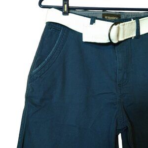 New without tags No Boundaries men's size 30 shorts are blue and made of 100% cotton. They have white belt, zip fly, button closure and two front and back pockets. The inseam is 12 inches.