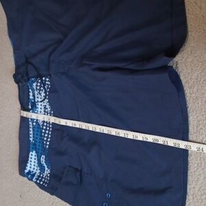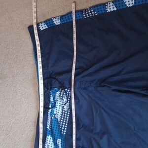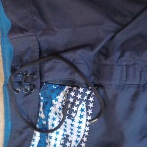 46 no boundaries men's swim trunks. velcro and tie closure. one side cargo pocket. 100% polyester. navy blue with white and blue star design. excellent pre-owned condition