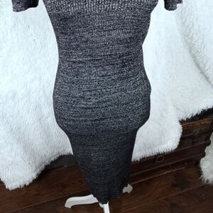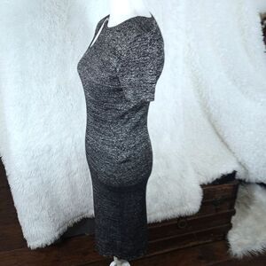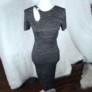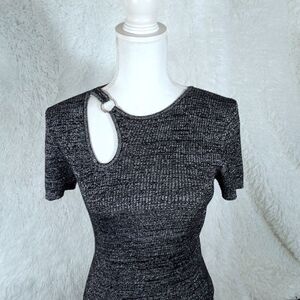 Chic metallic dress with shoulder cutout. Ideal for evening wear.