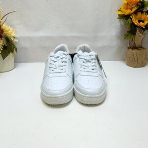 These sneakers offer a blend of contemporary style and practicality, boasting a wide width design for added comfort. Crafted with man-made materials and featuring memory foam insoles, they are structured for everyday wear. Their all-white aesthetic serves as a versatile choice for casual outings or low-impact activities, while the platform sole adds a subtle lift.