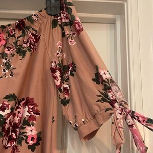 Stylish off-shoulder blouse with floral pattern. Features tie sleeves for added flair.