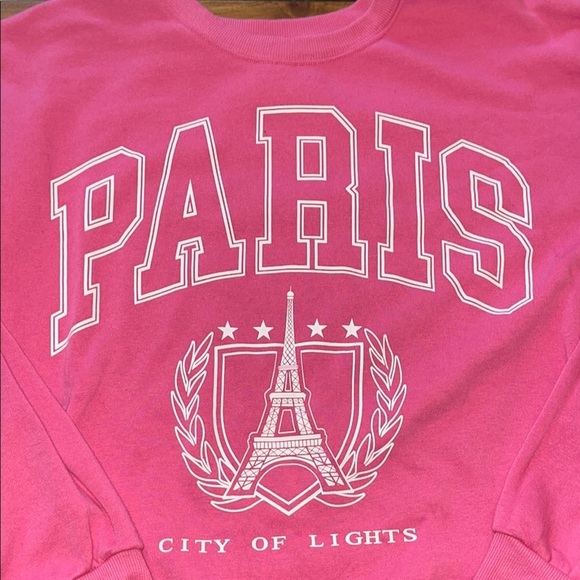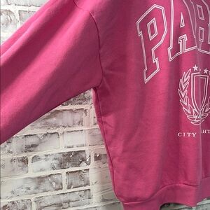 This vibrant pink sweatshirt from No Boundaries features a bold 'PARIS' text design in white collegiate-style letters, complemented by an emblem of the Eiffel Tower. The soft fabric ensures comfort, making it a perfect choice for casual wear.