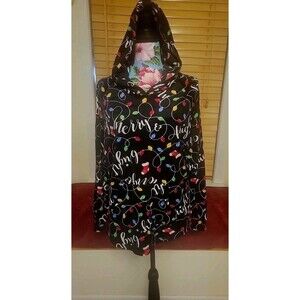 The No Boundaries Plush Christmas Pullover Hoodie in XL size for women features a trendy black design with string lights pattern, perfect for the holiday season. Made from a blended fabric of polyester and spandex, this hoodie is comfortable and breathable, ideal for winter, fall, and spring. With a pullover closure, hooded neckline, and pockets for convenience, this activewear piece is both stylish and functional. The Christmas theme and character details make it a festive addition to your wardrobe, suitable for various activities such as gym training and casual outings.