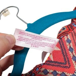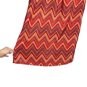 No Boundaries Red Chevron Striped Roll Tab Sleeve Dress. Juniors size large. In great preowned condition but the buttons at the roll tab sleeve may need to be reinforced eventually. Reddish orange color with other accents colors mixed in. Roll tab sleeves can be worn up or down. V neck. Lightweight polyester with no stretch.