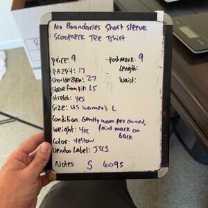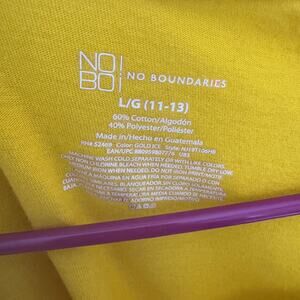 The No Boundaries Scoopneck Tee offers casual comfort with its relaxed fit and cheerful yellow hue. This versatile top features a flattering scoop neckline and short sleeves, perfect for everyday wear or layering under cardigans. Note the faint mark on the back of this otherwise bright shirt. The soft stretch fabric provides easy movement, making it ideal for casual outings, weekend errands, or pairing with denim for effortless style.