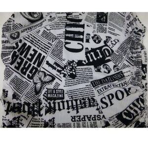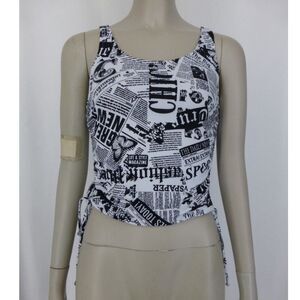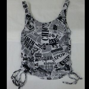 Description: Used once. Still in good condition. Ruched sides with adjustable ties. Newspaper graphic all over.