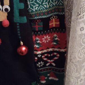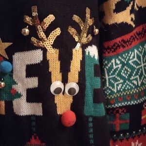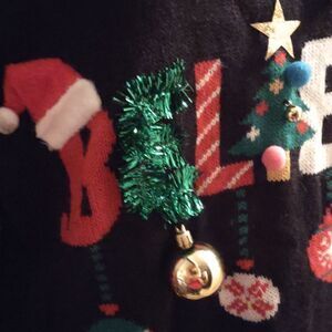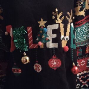 No Boundaries ultimate ugly sweater, black red gold green and white, junior size 15 to 17, Believe is written on the front with a Santa's hat Christmas tree Rudolph Christmas balls, bells that jingle jangle, green tinsel trim, snowflakes candy canes presents poinsettias reindeer and Holly on sleeves, back is plain, definitely a party stopper, excellent condition