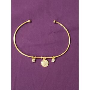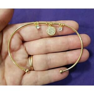 This is a nice cuff bracelet by No Boundaries. It is made of a wire band of 14KT flash gold plated sterling silver. It has three dangle charms with sparkly clear Cubic Zirconia crystals, two solitaires and one pavé cluster. It is sitting at a size 8 but is adjustable/bendable. It does have some tiny chips in the gold plating (see pictures). It does come in the original box. This is a pre-owned item, and it has minor wear, but still in good wearable condition.
