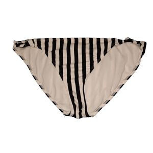 No Boundaries striped bikini bottom, size XL (15-17), juniors. The body is 82% nylon and 18% spandex. The lining is 100% recycled polyester. Multicolored black and white stripes. Features a knotted side detail. Lined, soft, stretchy, and smooth feeling. Machine washable, line dry.