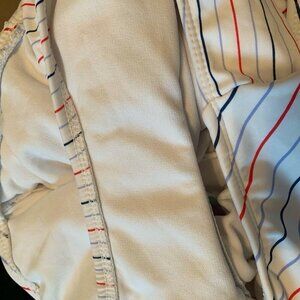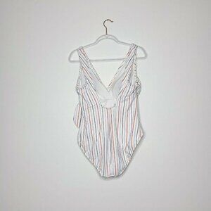 One Piece Swimsuit. Wrap Top Style with Side Tie. Scoop Back. White with Red and Blue Vertical Stripes.