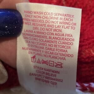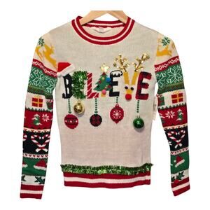 No Boundaries women’s Christmas sweater, size XS. White base with colorful knit sleeves featuring reindeer, snowflakes, presents, and festive motifs. Front spells out “BELIEVE” in bold letters with 3D embellishments including tinsel, pom-poms, ornaments, bells and googly eyes. Crew neckline, long sleeves, and ribbed trim. Made from 100% acrylic. New with tag.