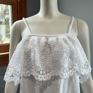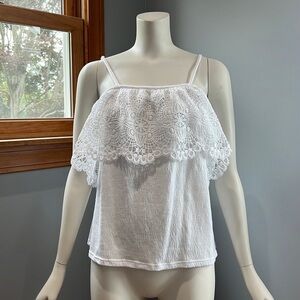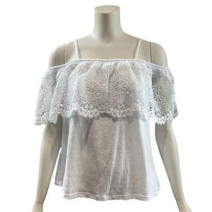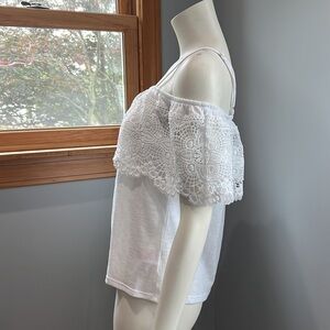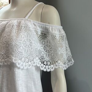 No Boundaries white off-the-shoulder top with lace and spaghetti straps. Waist length. Juniors size Extra Large (15/17).
