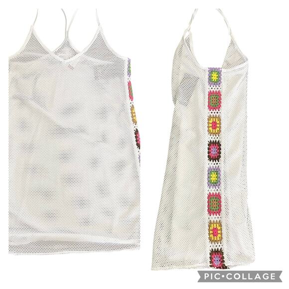 No Boundaries White Mesh Crochet Granny Square Inset Swim Cover Sz MED Cottagecore. White mesh front and back with crochet granny squares running down each side. New with tags. Junior sizing.