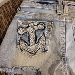 No Boundaries Womens Denim Cutoff Shorts Sz Small Low Rise Rhinestone Anchor