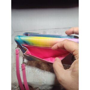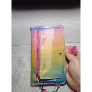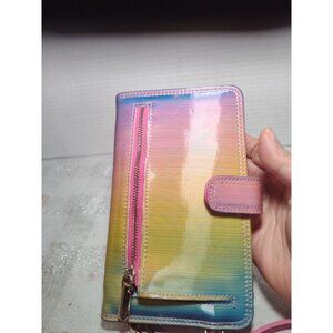 This is a brand new No Boundaries Women's Phone Case Crossbody Wallet without tags. The wallet features a solid iridescent color and is made of vinyl material. It includes accents like a button, strap, and zipper, and has a front flap compartment for a phone, credit card slots, side-snap closure, and ring hooks to attach keys. The compact size makes it convenient for on-the-go use, and the stylish design adds a touch of elegance to any outfit. Perfect for women who value functionality and fashion.
