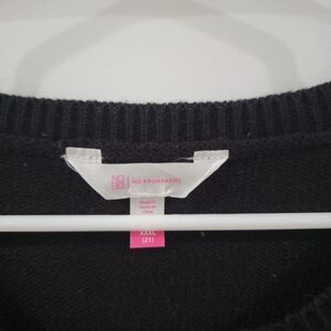 The No Boundaries Women's Ugly Christmas Sweater in Size XXXL features a tight-knit design with a crew neck and long sleeves, perfect for the holiday season. Made of acrylic material in a black color, this pullover sweater showcases Santa Claus as the character, making it a fun and festive addition to your winter wardrobe. The plus-size fit and stretchy fabric ensure a comfortable and stylish look, ideal for embracing the Christmas and holiday themes with a quirky and playful style.