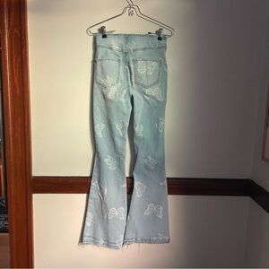 Chic light blue jeans with a unique butterfly pattern. Flared leg style for a trendy look.