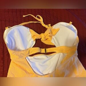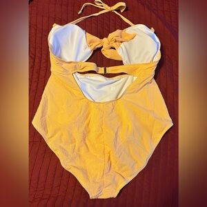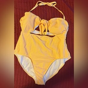 Stylish one-piece swimsuit. Features a halter neck and front cutout. Perfect for beach days.