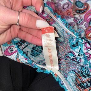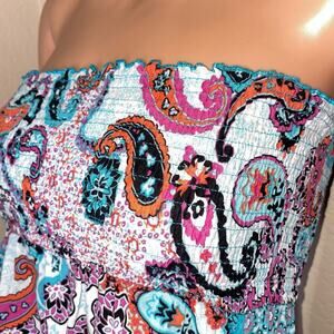 Strapless sundress, paisley print tube dress, boho summer dress, multicolor strapless mini dress, smocked bodice dress, ruffle hem sundress, casual beach dress, festival bohemian style dress, lightweight strapless dress, vibrant printed summer outfit.