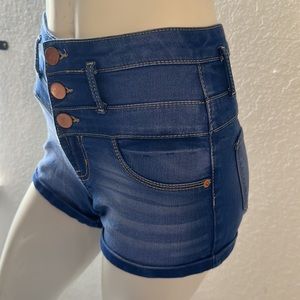 3 Button Corset Jean shorts flatter your shape with a curve hugging fit and wide, no gap waistband. Four pocket design and rolled up cuffs for an easy going look.