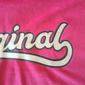 No Boundaries pink and white velour hoodie pull over sweatshirt, striped at the sleeves, "ORIGINAL" wording across front, pull string, ribbed on the cuffs and waistline,
