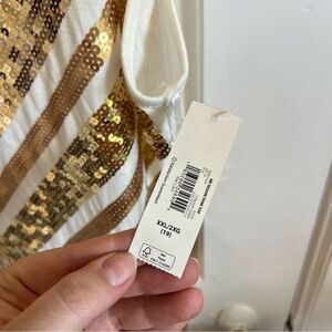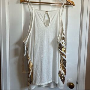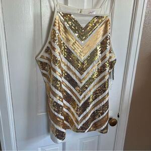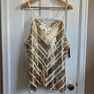 This stunning camisole top features a dazzling array of gold and white sequins, perfect for catching the light at any event. With its sleeveless design and delicate spaghetti straps, it offers a chic and elegant look. Ideal for special occasions, this top is both stylish and eye-catching.