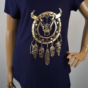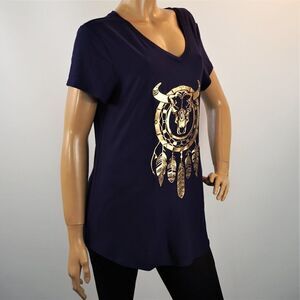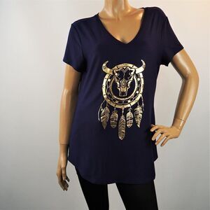 No Boundaries Shirt Longhorn Print Blue Gold Stretch V Neck Women Sz XL 15 -17